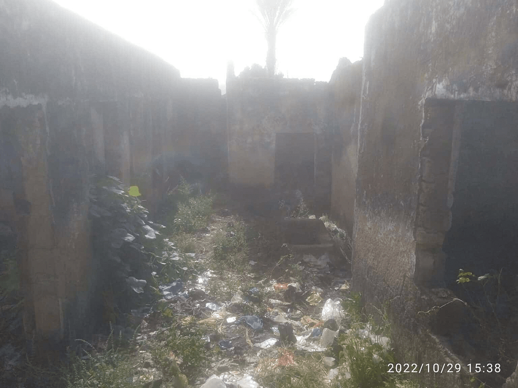 The building is said to have been abandoned for a long time and is now used for open defecation and dumping.
