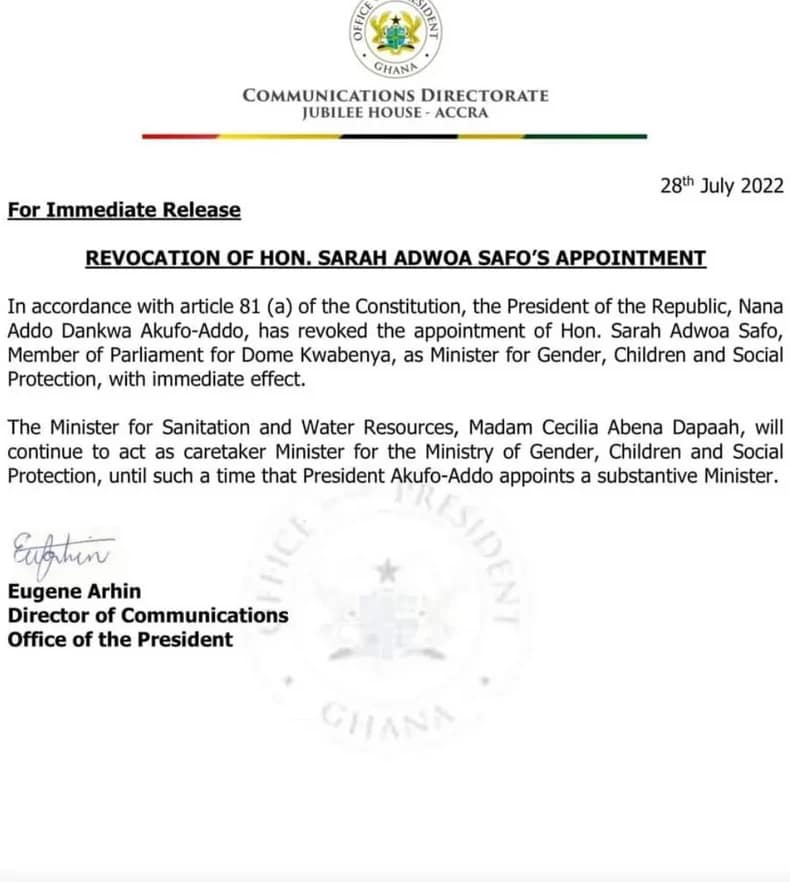The President has revoked Adowa Safo’s appointment letter with immediate effect as sighted by the letter signed by the Director of Communications at the office of the President.