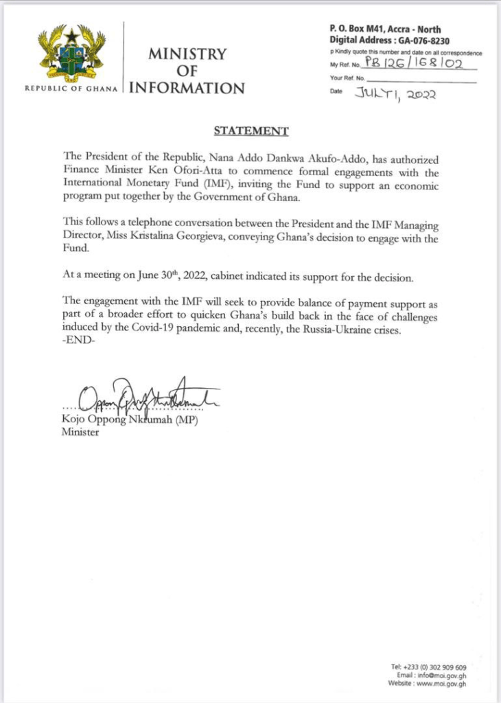 “The President of the Republic, Nana Addo-Dankwa Akufo-Addo, has authorized Finance Minister, Ken Ofori-Atta, to commence formal engagements with the International Monetary Fund (IMF), inviting the Fund to support an economic programme put together by the Government of Ghana”.