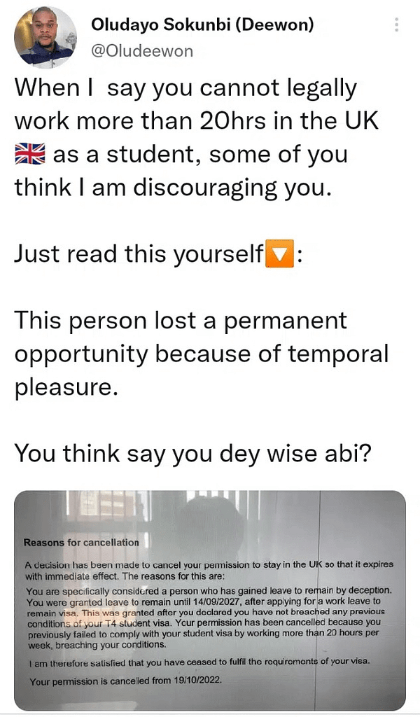 A Twitter user named @Oludeewon posted this article, claiming that foreign students are legally not allowed to work more than 20 hours a week in the UK.